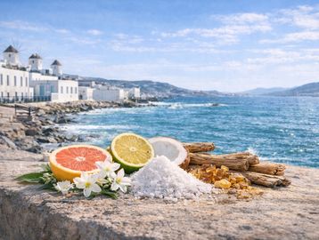 Mykonos, a real treat for the senses. It unfolds its unique fragrance as your senses would in walking the sun-kissed pathways of Mykonos. Through our creation, you'll traverse from bergamot and grapefruit through Hedione flower to petrichor with hints of amber musk air and the invigorating brine of the Aegean Sea as it mingles with the warmth of sunbaked wood and the aged stone of the ruins.